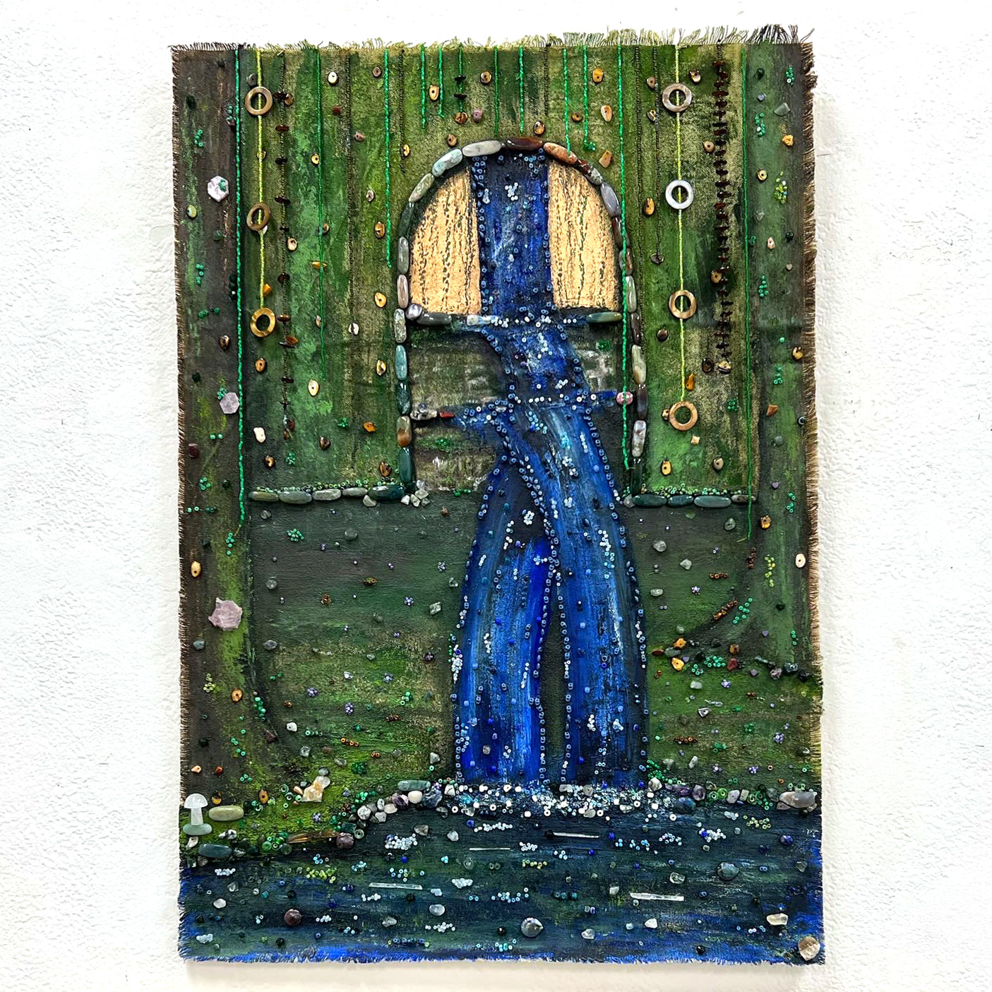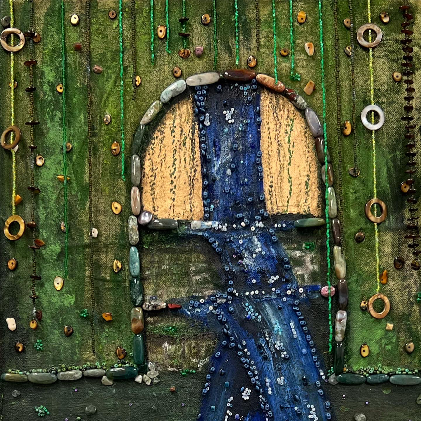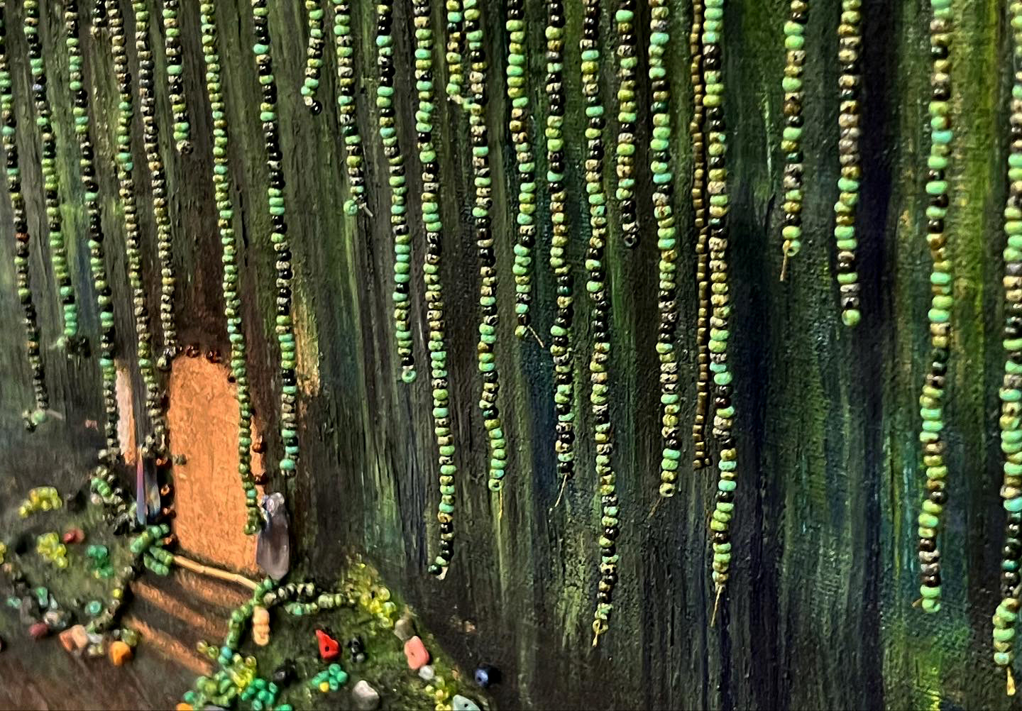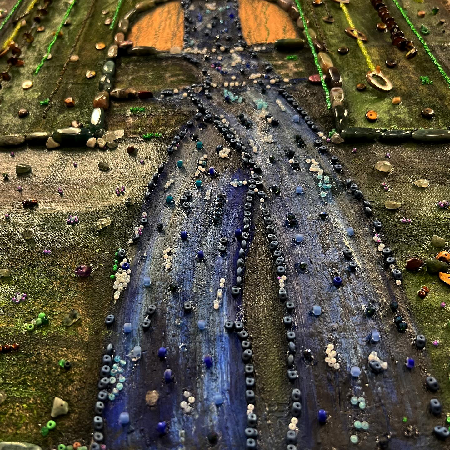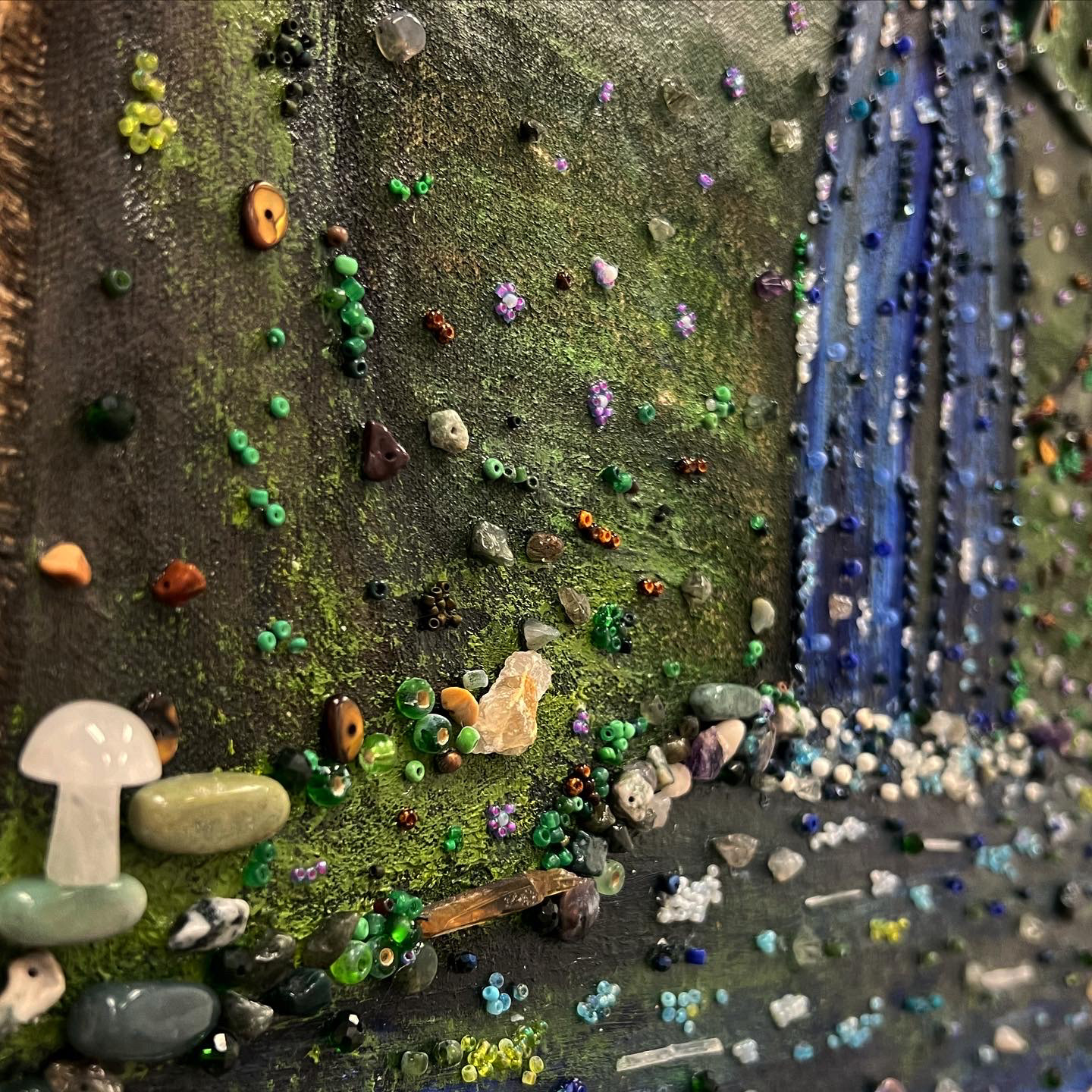 For my senior project I decided to combine two of my favorite mediums in order to create depth and texture. The pieces are 24x 18" on canvas thats mounted on plywood and has beads and crystals woven into the piece.